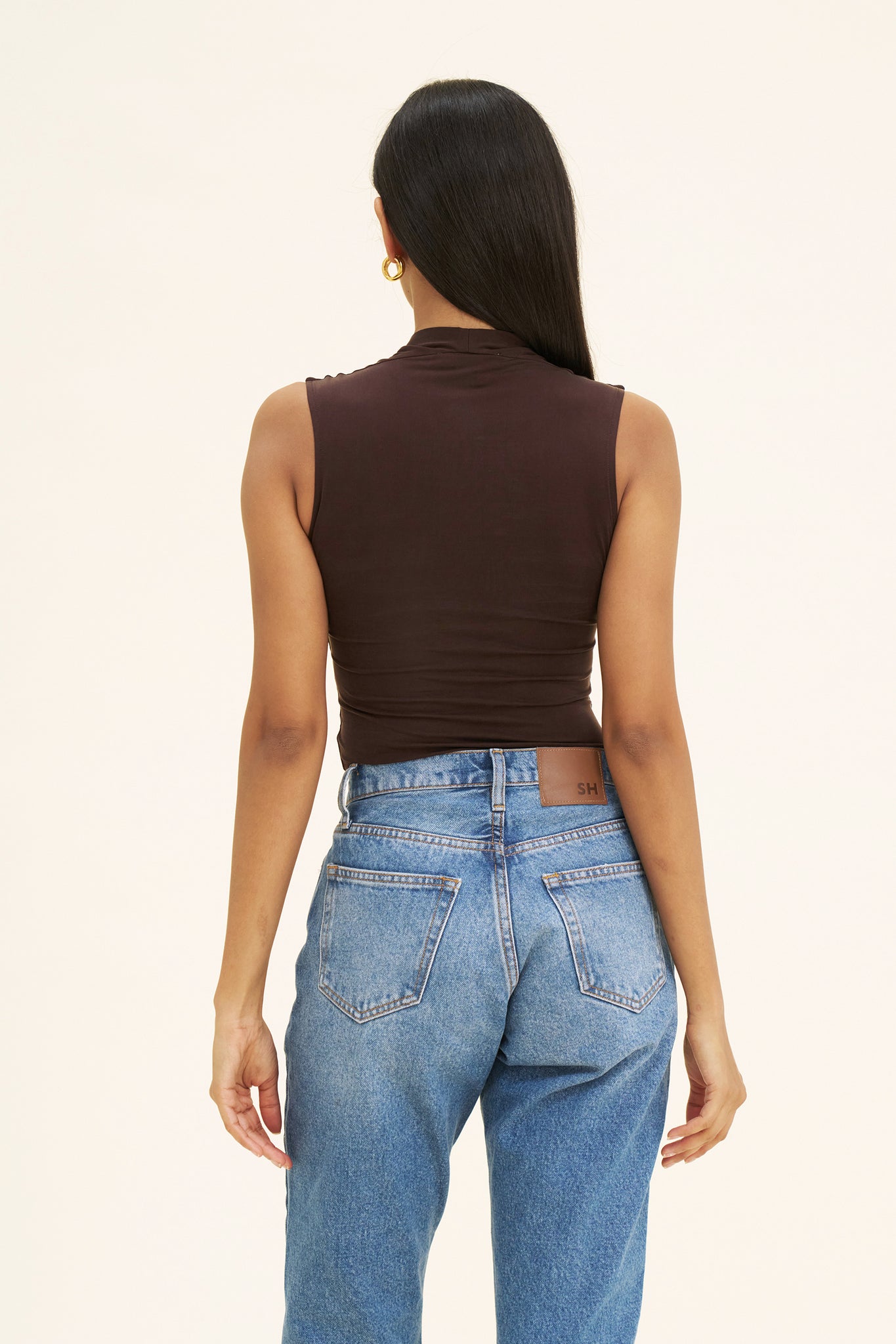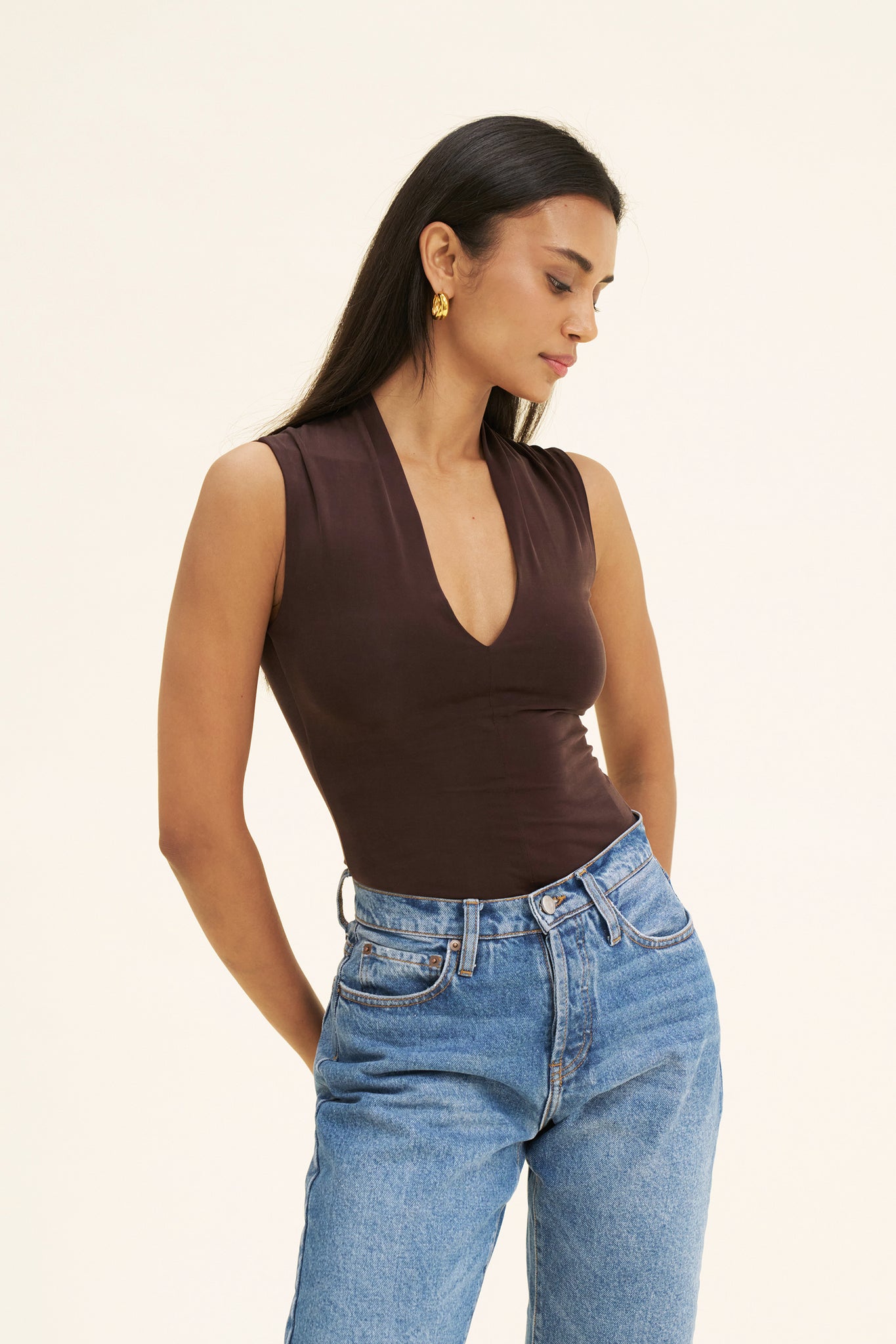 Valentina has a deep V neckline and pin tuck detail on the shoulder. She's a sexy basic made from the best quality stretch Cupro. Model wears size XS and is 5'9 / 180cm.