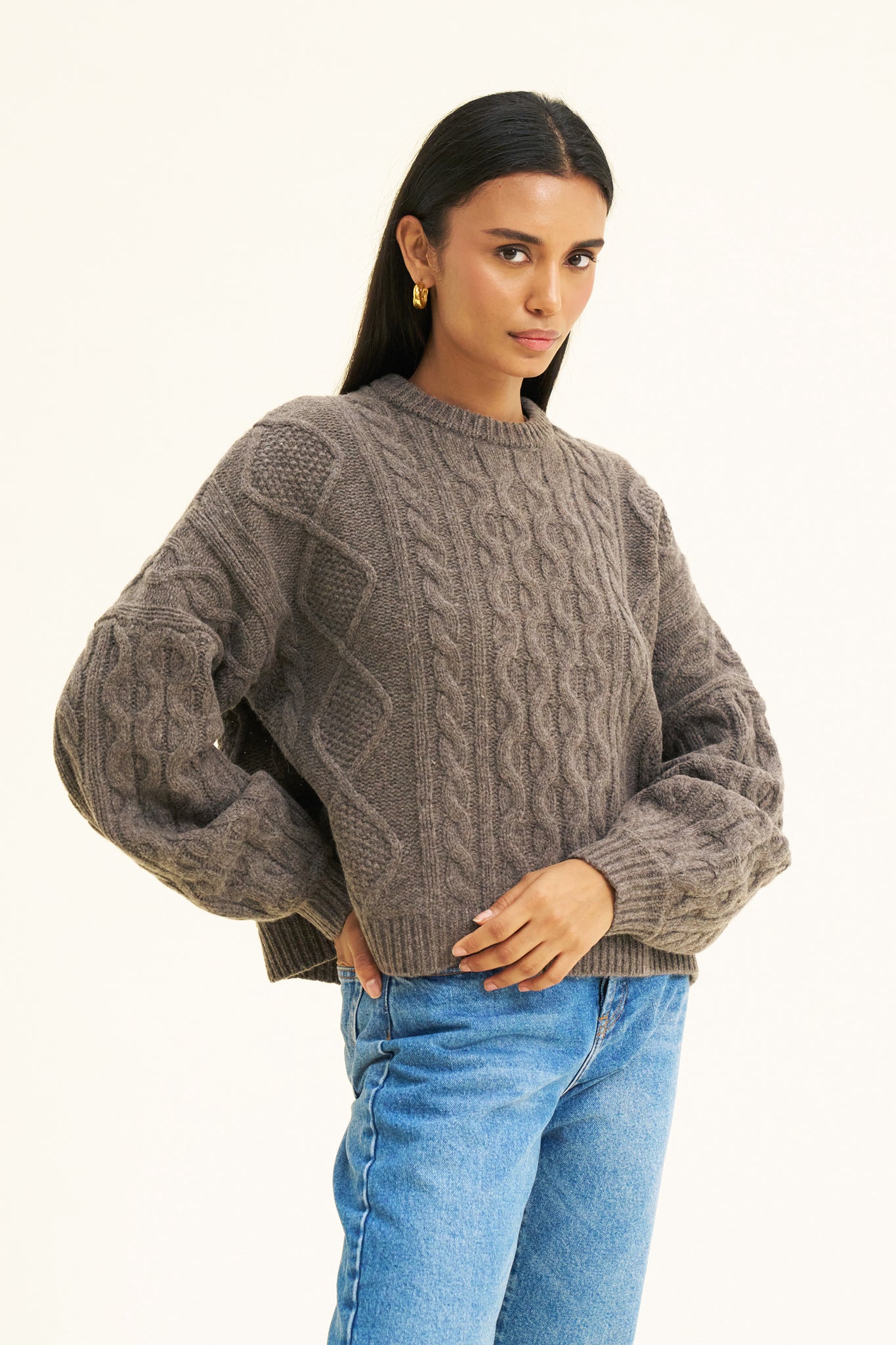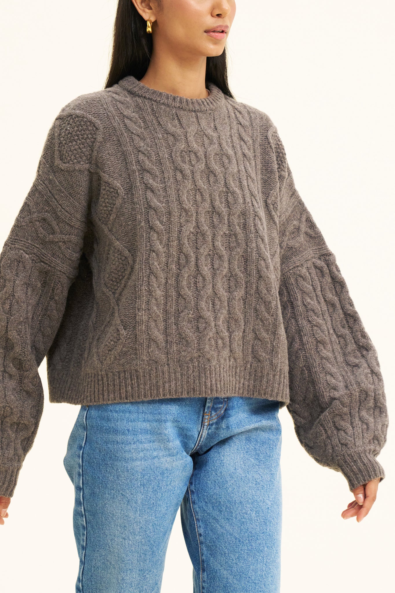 The perfect winter staple, cable knit and boxy with oversized sleeves. Cosy up in 100% RWS certified Merino Wool. Model wears size S, she is 5'9 / 180cm.